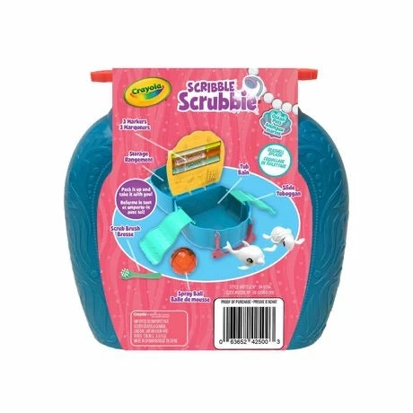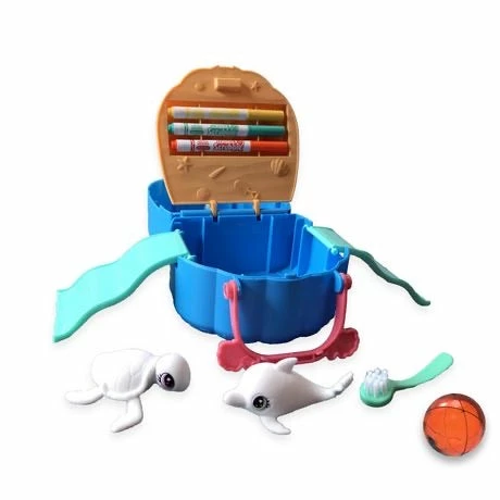 • Includes portable playset, 2 washable ocean animal figurines, 3 washable markers, scrub brush and spray ball