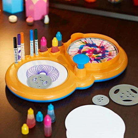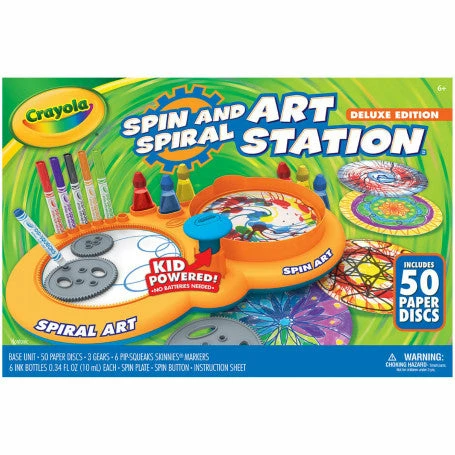 Back and better than ever, the Crayola Spin & Spiral Deluxe Edition offers over 60 art supplies including 1 Spin & Spiral unit in blue and orange, 50 Paper Discs, 6 Bottles of Drip Ink (2ea. R/B/Y), 6 Crayola Pip Squeaks Markers, 3 Spiral Art Gears, 1 Removeable Spin Art Plate, and 1 Instruction Guide. This art kit focuses on spin and spiral art activities, embracing kid-powered crafts that are fun and easy! With so many supplies provided, kids can keep the fun going for longer and even share with friends! While all the art supplies needed to get started are in the box, when you need paper refills, your standard paper plates will work perfectly. Suitable for ages 6+!
