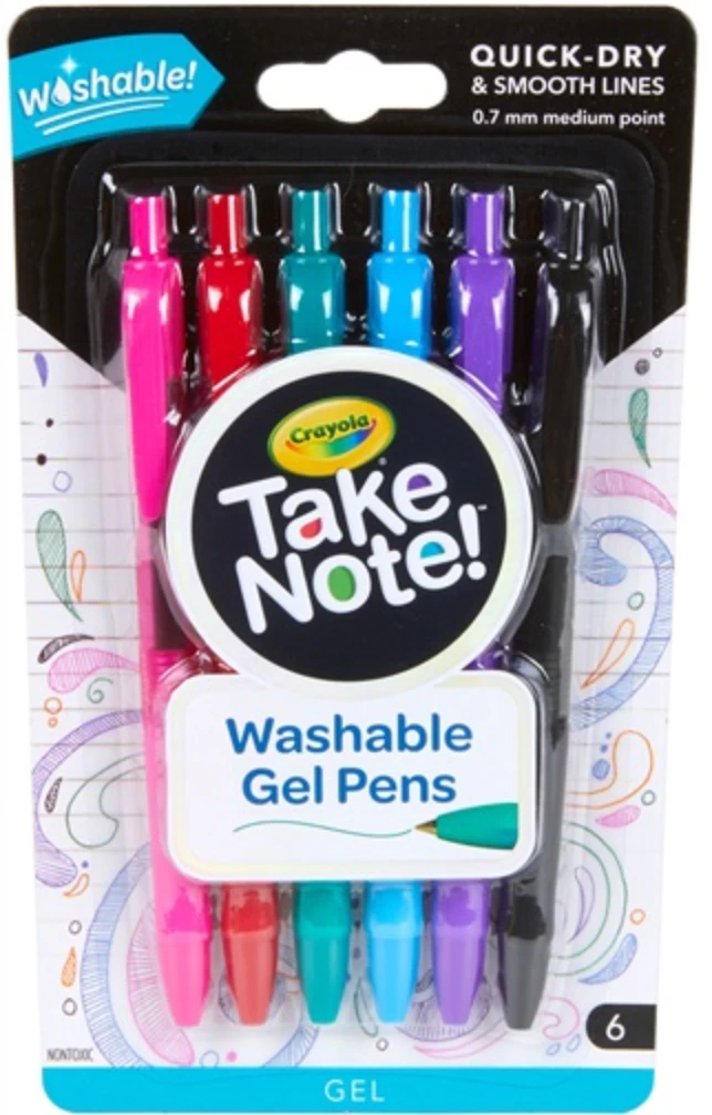 Create vibrant art and notes with Take Note! washable gel pens from Crayola. Each washable gel color lays down smooth and streak-free with a cool click of these ergonomic, cushioned-gripped pens. Create colorful special effects with the washability you expect from Crayola®. Perfect for taking notes, art projects and organizing documents by color. Includes 6 washable gel pens in 6 vibrant colors.