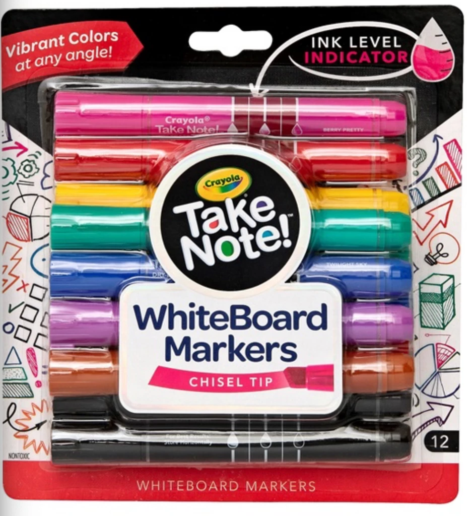 Crayola Take Note Whiteboard Markers are quick to dry but easy to erase! Vibrant colors are great for bold messages on most white boards. Each marker has a chisel tip that is perfect for thick or thin lines and features an ink level indicator so you always know when it’s time to restock. The markers are low odor, making them ideal for classrooms, offices, and meeting rooms.