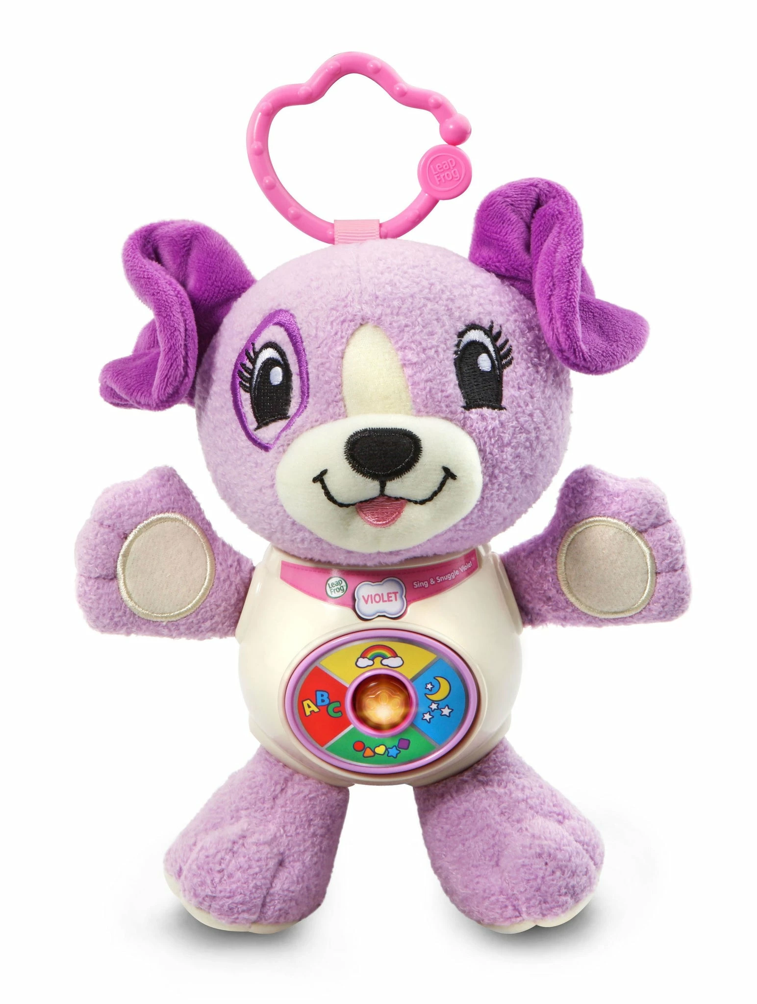 Your favourite friend is ready for learning on the go. Sing & Snuggle Violet™ is a plush interactive puppy that talks and sings. Press the light-up button in the middle of her tummy to hear Violet bark and tell you how much she loves you. Then, press the colourful buttons to hear lullabies and learning songs about shapes, colours and letters. Use the ring on Violet’s head to attach her to car seats and carriers for fun on the go. Grab the playful pup and learn with your loyal friend anytime, anywhere!