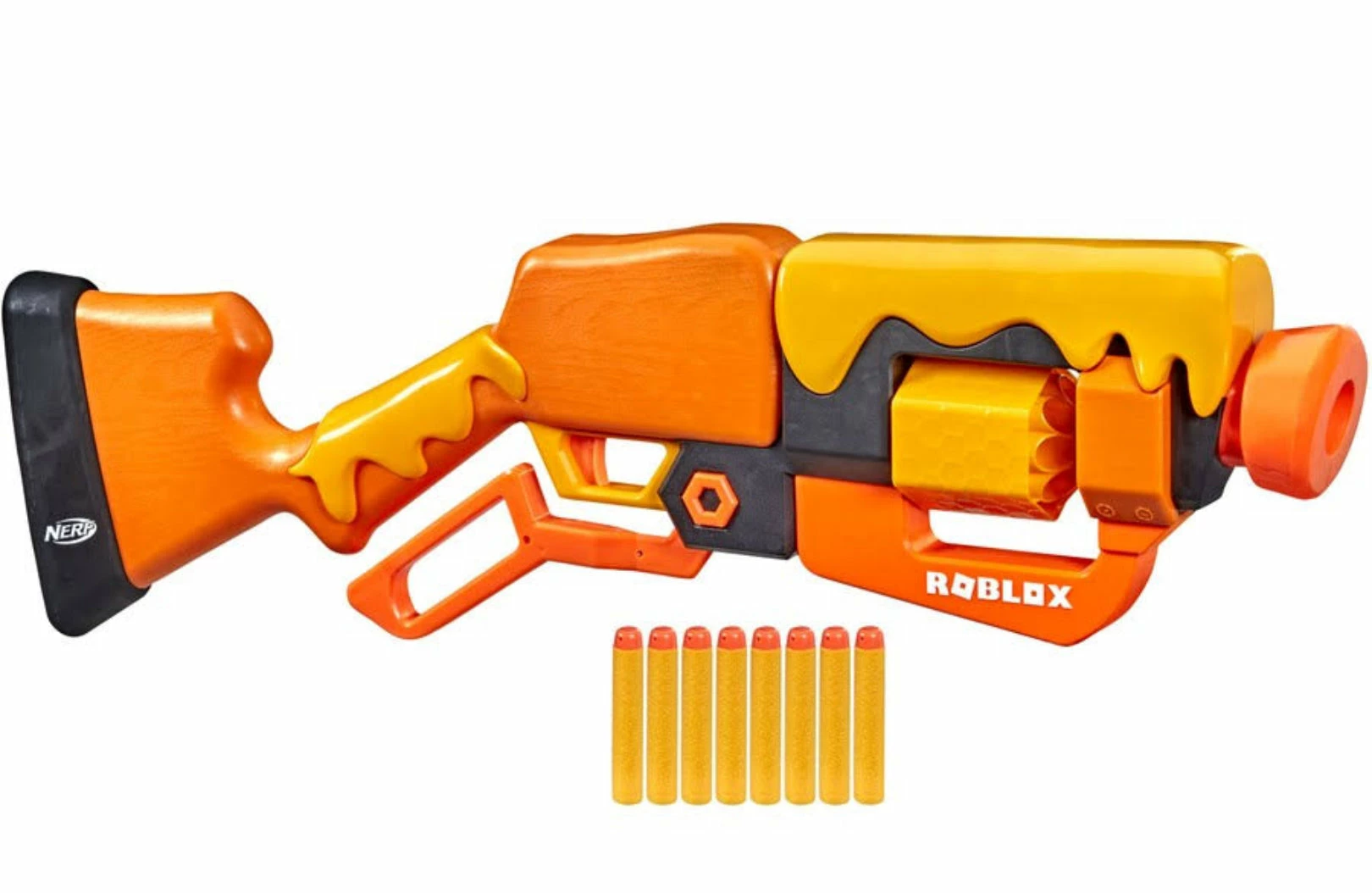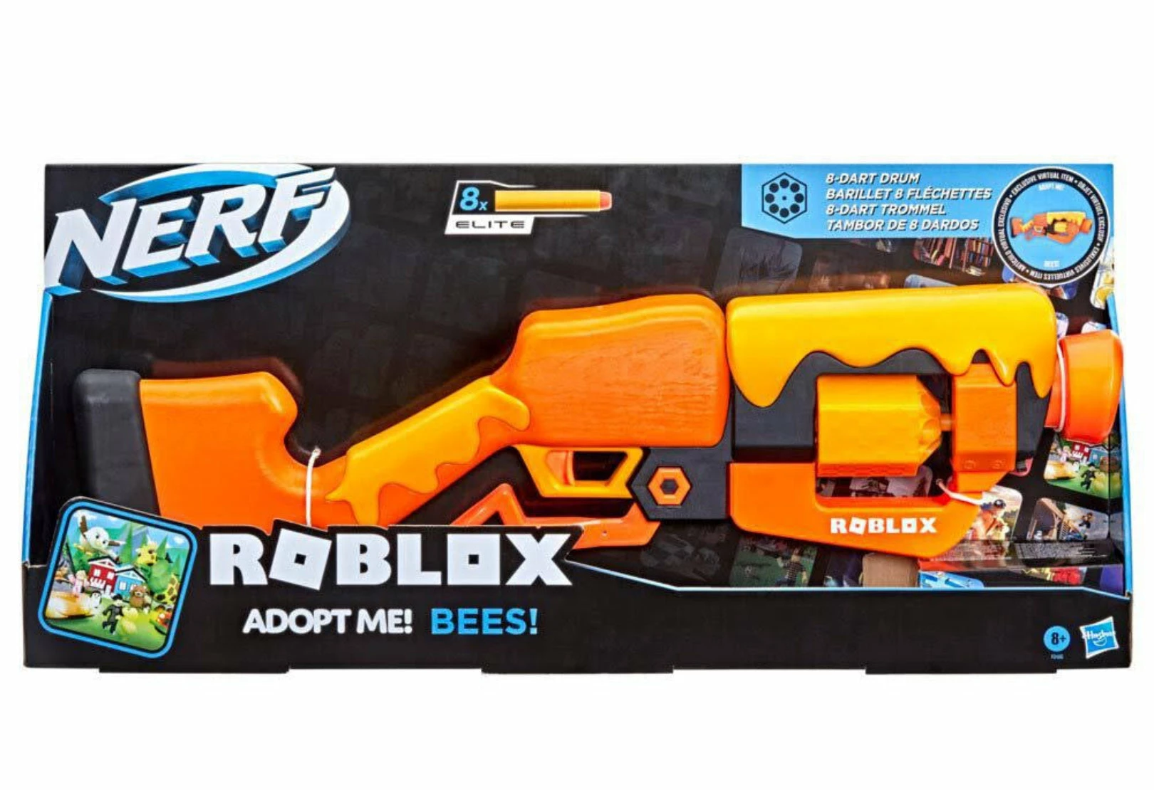This Nerf Roblox Adopt Me!: Bees! dart-firing blaster takes its inspiration the Roblox Adopt Me! game! It includes a special code that allows you to redeem an exclusive virtual item on Roblox! The blaster features lever-action blasting and a rotating 8-dart drum, and includes 8 Nerf darts so you can fire 8 darts in a row. Load the drum, move the lever to prime the blaster, and press the trigger to unleash a dart.
