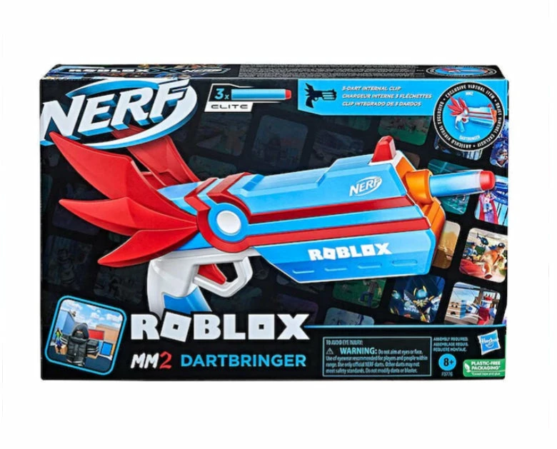 Fire away at the competition with a blaster that unleashes 3 darts in a row. Insert 3 darts into the clip, move the slide to prime the blaster and pull the trigger to fire 1 dart. The Nerf Roblox MM2: Dartbringer blaster includes 3 Official Nerf Elite foam darts to fully load the internal clip.