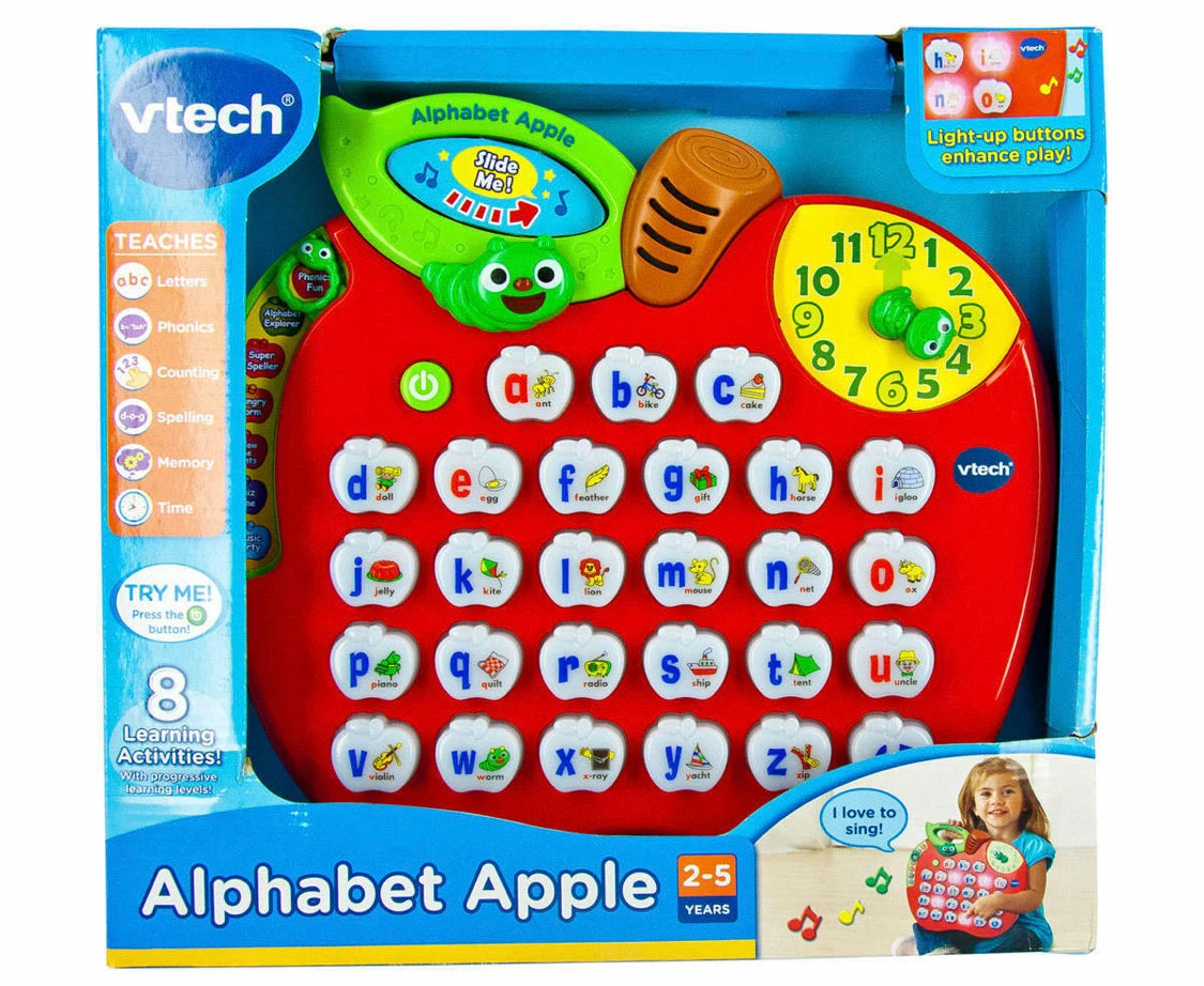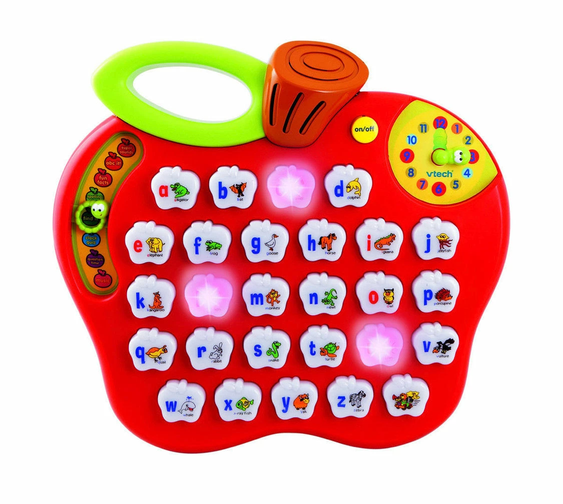 Learning with a crunch! With seven fantastic modes of play the Alphabet Apple has lots of exciting and challenging learning games that increase in difficulty giving new levels of game play! Discover the world of phonics and learn objects by finding them on the apple buttons. Test your memory by following the flashing light-up apples and then try to copy the light sequence. Learn how to tell the time using the clock! Helping your little one develop hand-eye coordination, independent play, word building and cognitive development the Alphabet Apple is your child’s perfect learning board!