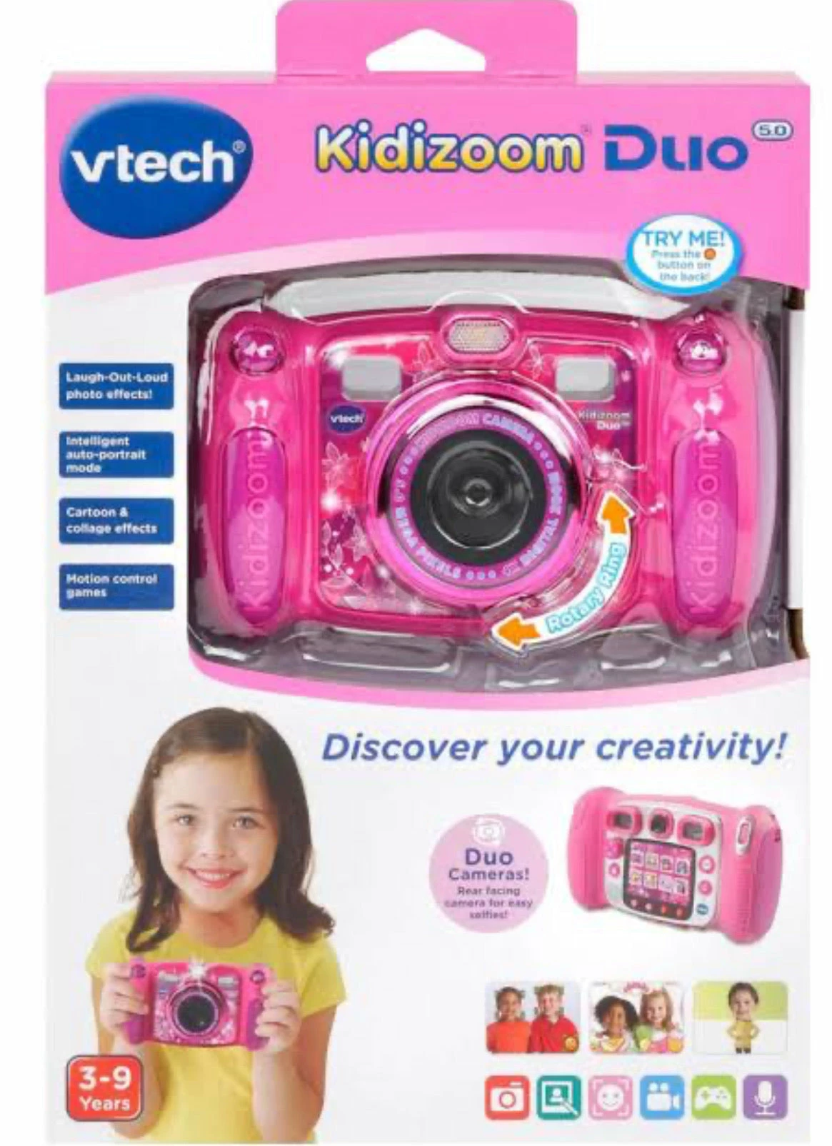The Kidizoom Duo 5.0 camera features built-in auto-flash, large colour screen, 4x digital zoom and also voice recorder with voice changing effects and cool built-in games. You can also transfer files to your PC and edit and enhance your photos and videos with over 70 great effects. This child-friendly camera encourages independent and creative play and hand eye coordination of your child.