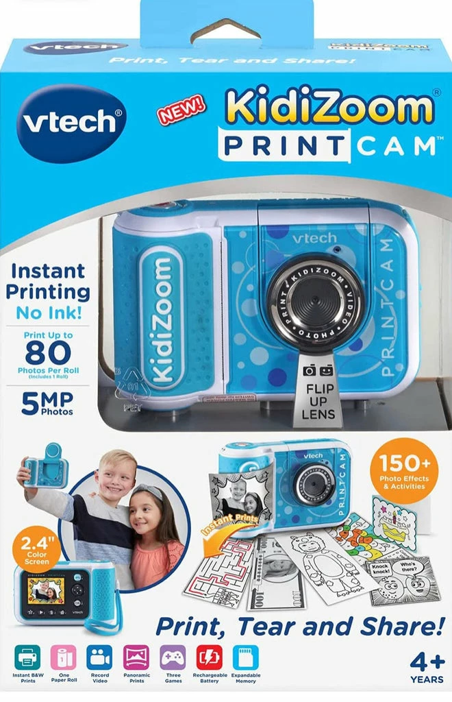 Take a photo and print it instantly with the KidiZoom Print Cam! The flip-up lens allows for easy selfies too. The camera is jam-packed with fun features like special photo effects, stamps and borders, 3 games, panoramic prints and comic strip maker. You can also turn your photos into line drawings to colour or use the print shop to print games, design and print your own cards, pretend money, accessories, and more. Also functions as a normal digital camera: you can take videos and save photos and videos and transfer by USB. Memory is expandable by microSD card.