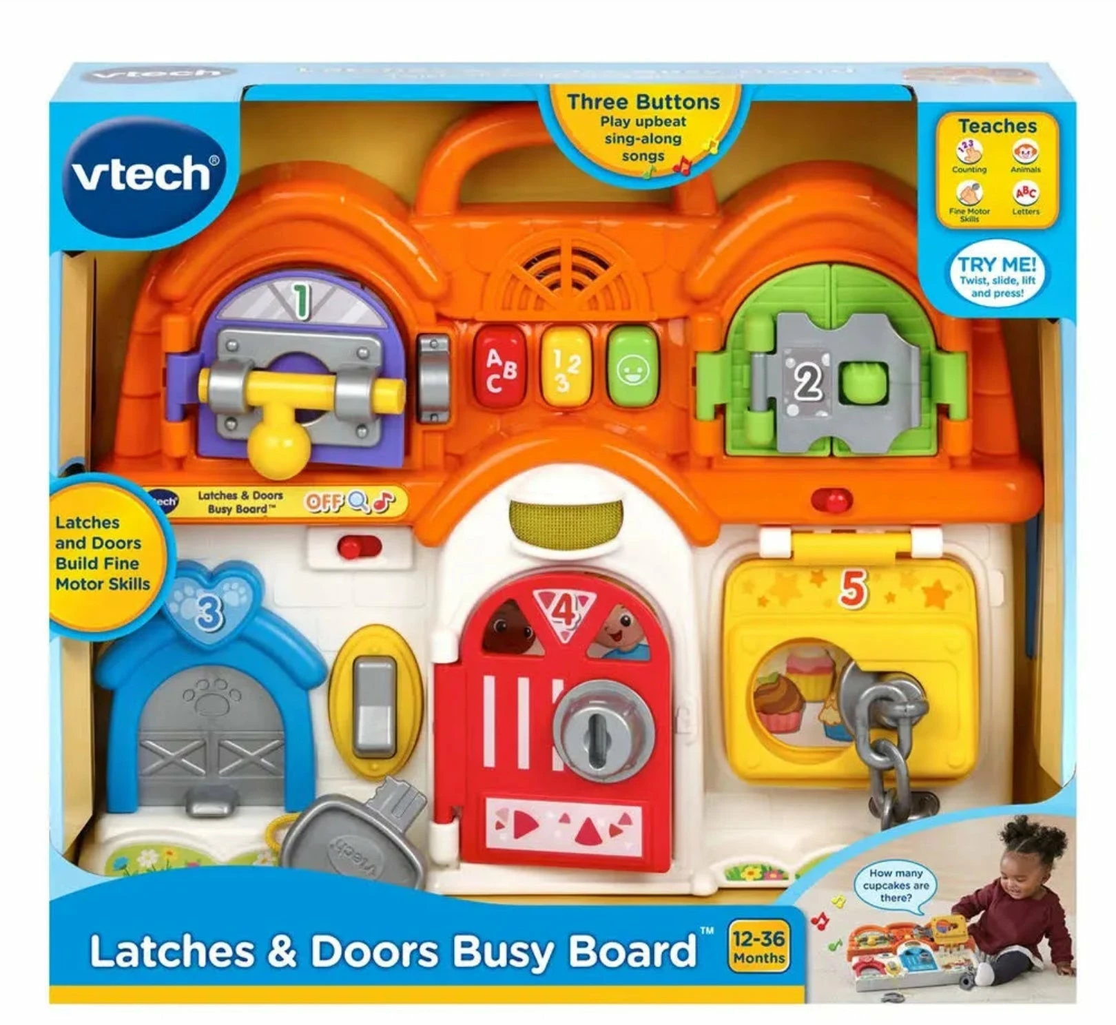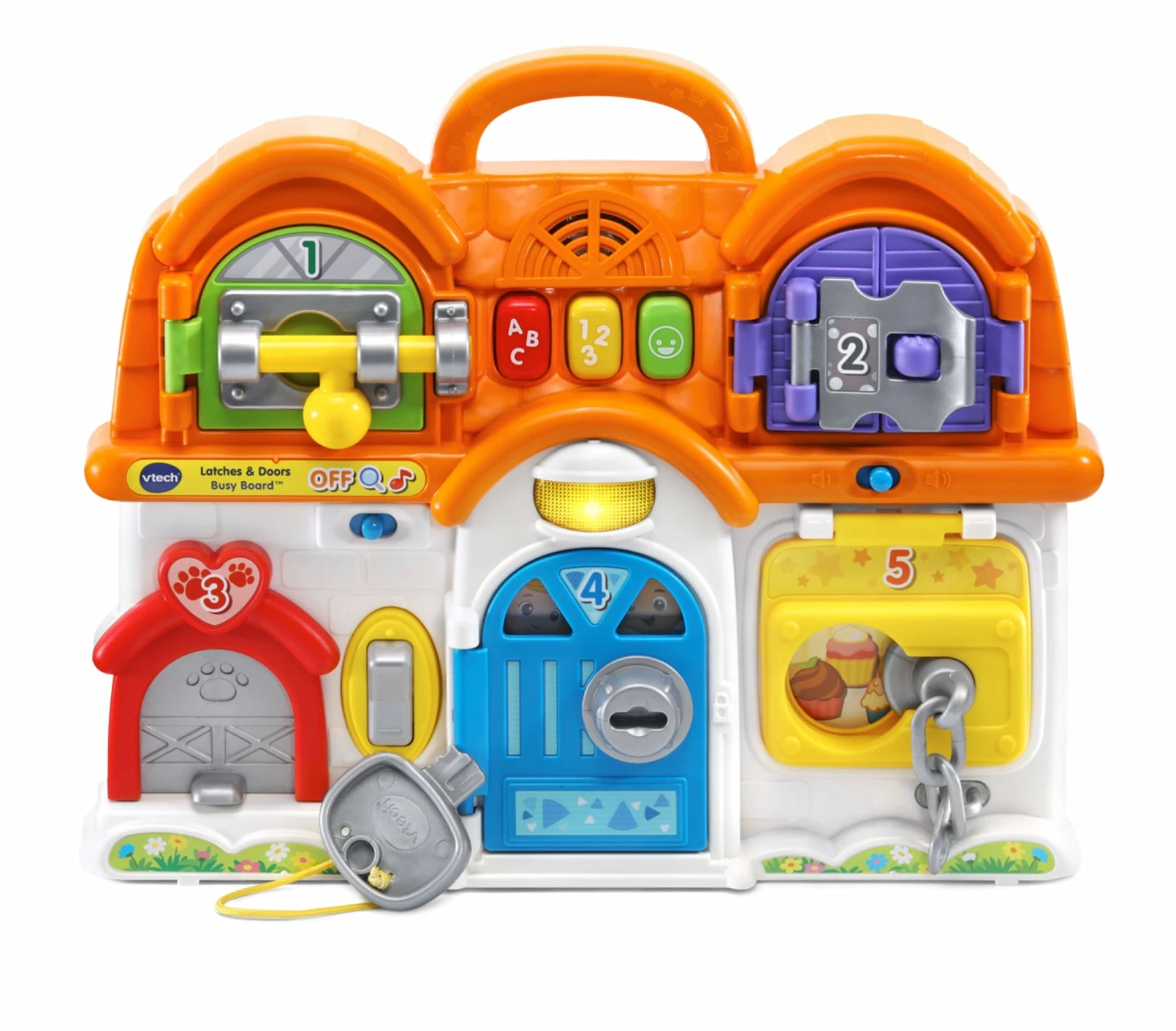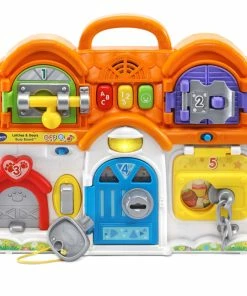 Knock, knock! Welcome to the adorable little house. Move the attached pieces to discover different scenes of cute animals, a friendly family and objects behind every window and door. Press three colourful buttons for fun songs and sound effects. Includes a built-in handle for take-along play. Press three colourful buttons to hear the Alphabet Song, a number song or a playful song about the house.