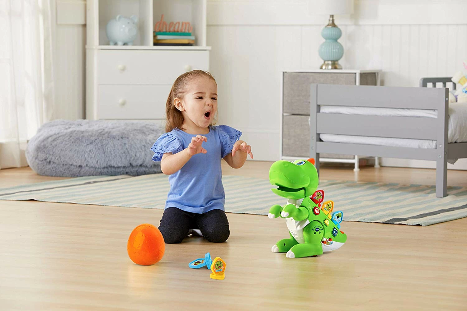 Time to make this dino sing, stomp and spin. 9 action plates customise the dinos voices emotions and dancing styles. 3 light up buttons teaches colours, shapes and music. There’s even more than 30 sing along songs and melodies and a dino egg to store the plates.
