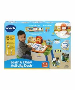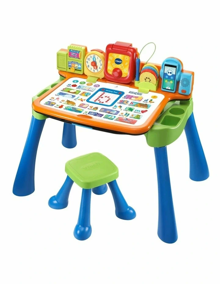 Inspire a love for learning with the VTech Learn & Draw Activity Desk! This 5-in-1 flexible learning centre and stool includes an interactive desk top, projector, LED writing pad, chalkboard and art station. Discover 200 touch-and-learn spots on five interactive activity pages. Explore the alphabet, numbers, counting, music, shapes, colours, the human body, clothes and weather.
