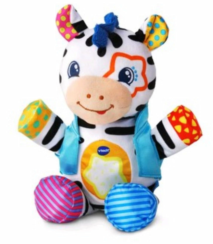 Meet the funky Lights and Stripes Zebra by Vtech! This cute soft fabric zebra has lots of style and could just be the coolest zebra in the cot! Zebra‘s silky fabrics provide comforting tactile stimulation and will also visually stimulate your little one. Crinkly paper hooves and ears have different colourful patterns and encourage tactile stimulation. When you press the colour changing light up button on zebra‘s tummy he will play exciting music, cool songs and fun phrases which support and encourage language development. Includes 3 catchy sing-along songs and 15 melodies which encourage auditory and language development.
