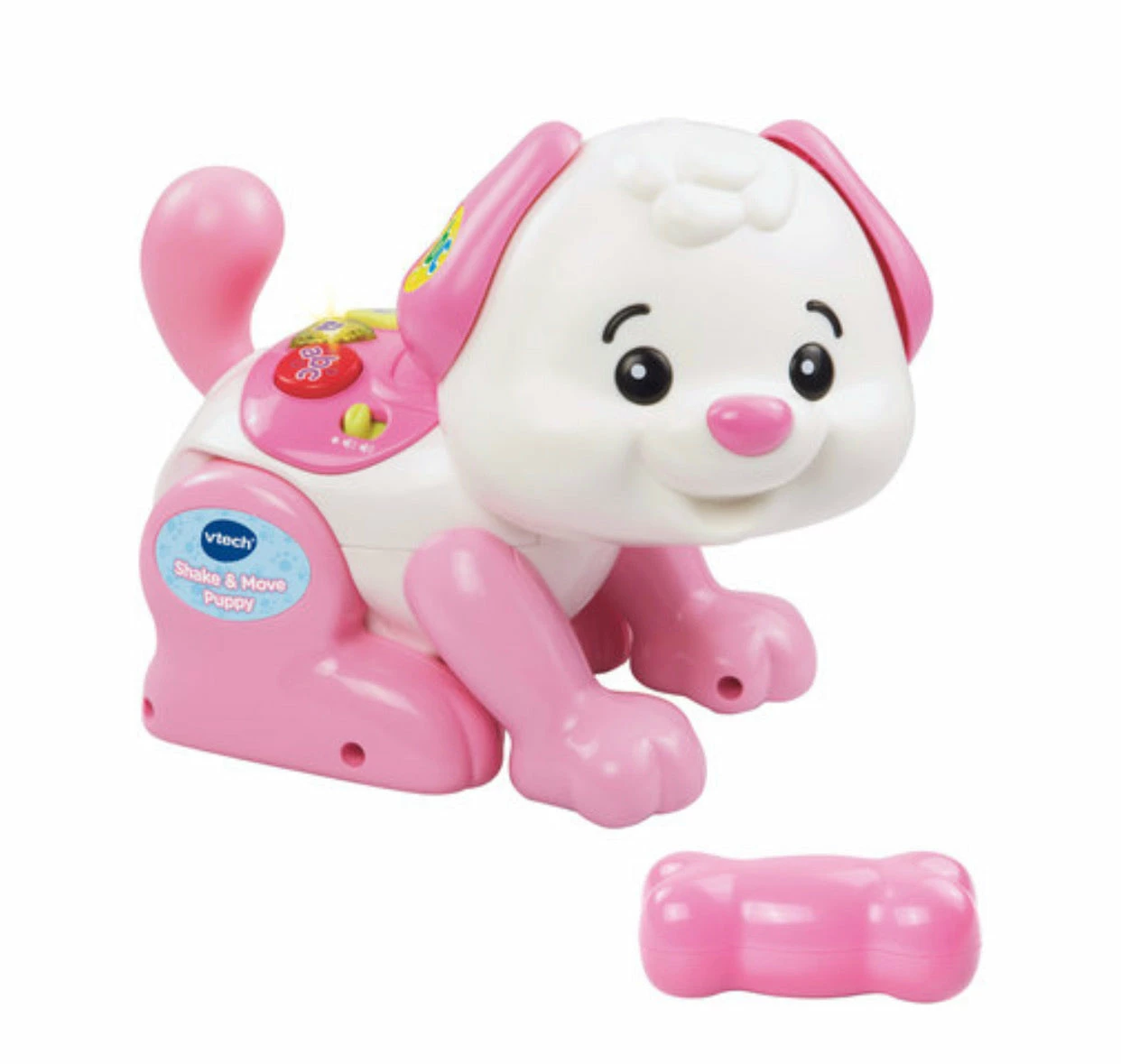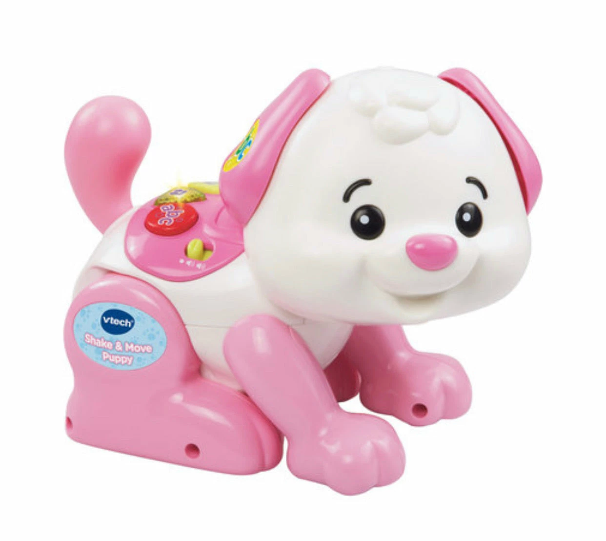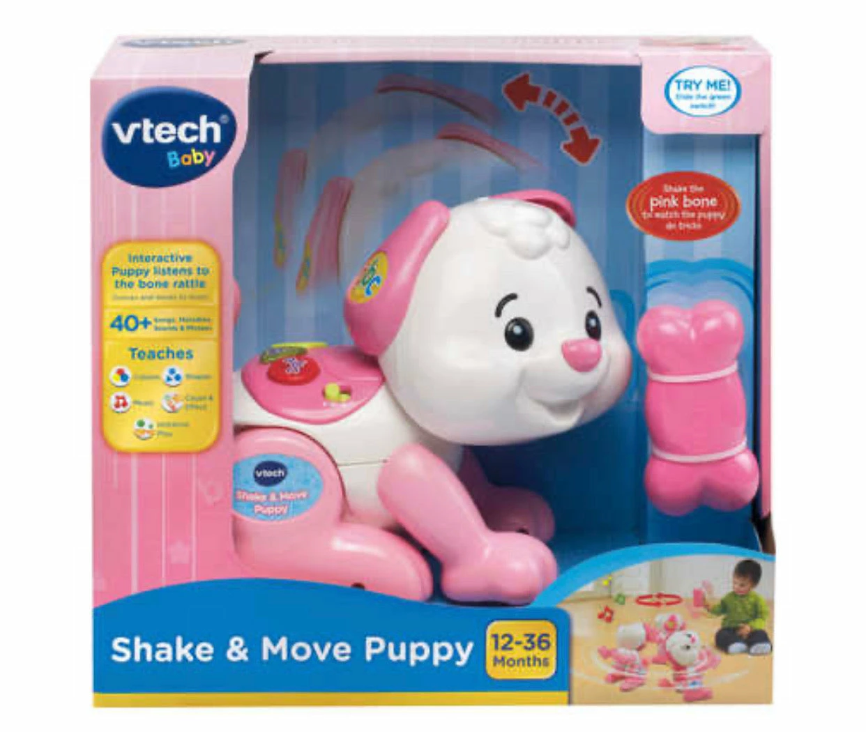 Let’s get going with the Shake and Move puppy! Watch this super cute and playful pup move, stand on his back legs and turn around when the bone shaped rattle is shaken. There are three different shaped press buttons on the puppy’s back that teach shapes, colours, abc and 123. The puppy promotes motor skills, imaginative play and an understanding of cause and effect through interaction with the rattle and the buttons. This cheerful pup also features 2 happy sing-along songs, 10 jolly melodies and lots of fun sounds. The light will flash along to all of the sounds and music!